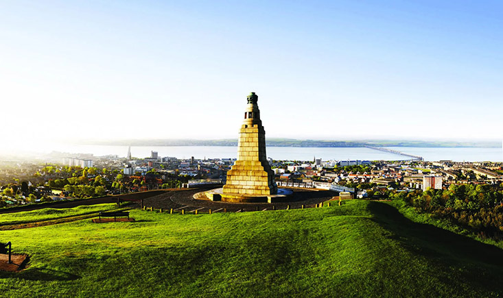 At the summit stands a war memorial, solemn yet proud, looking out over the rooftops and spires. From this vantage, one can trace the line of the Tay Rail Bridge stretching across the estuary, and the distant shimmer of fields beyond.